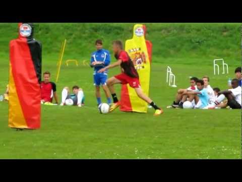 これは日本国内のウィークエンドセッションでも行うスキルテストですが、走りながら4つの目標すべてにボールを入れる時間を測ります。